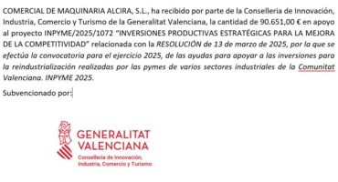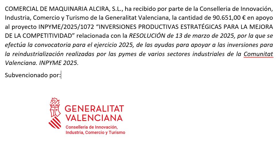 COMERCIAL DE MAQUINARIA ALCIRA, S.L., ha recibido por parte de la Conselleria de Innovación, Industria, Comercio y Turismo de la Generalitat Valenciana, la cantidad de 90.651,00 € en apoyo al proyecto INPYME/2025/1072